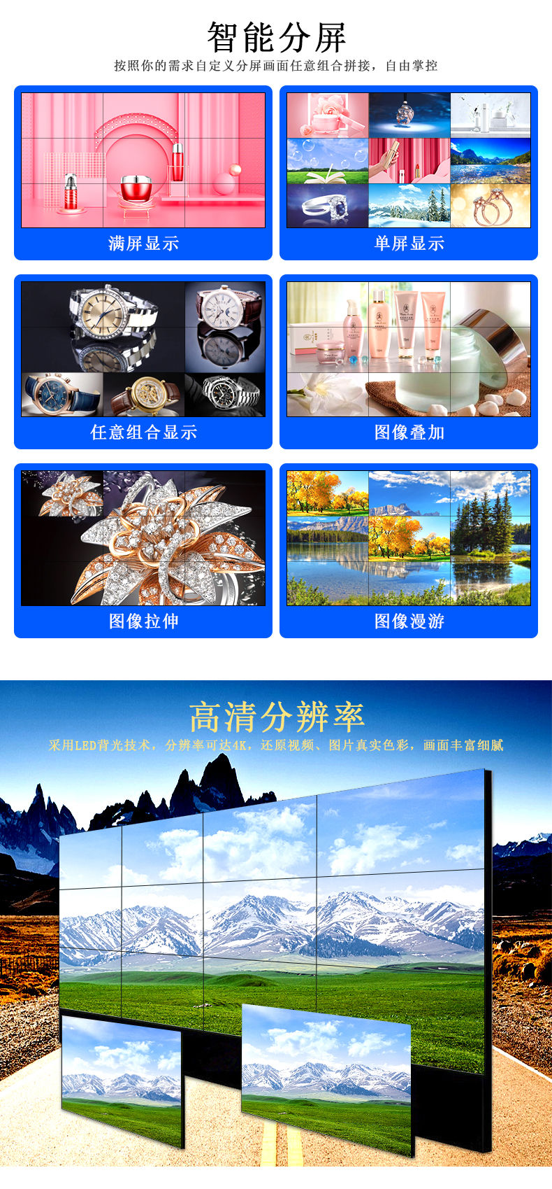 【美佳愛(ài)-4k液晶拼接屏生產(chǎn)廠家電話400-997-9971】京東方55寸液晶拼接屏-拼縫3.5mm產(chǎn)品通過(guò)ISO9001_3C_節(jié)能認(rèn)證等30多項(xiàng)認(rèn)證,主營(yíng)LG/京東方/三星大屏幕電視墻,其尺寸有32寸40寸43寸46寸49寸55寸65寸75寸液晶拼接單元,也有曲面,弧形,柔性,無(wú)縫LED顯示屏,顯示器,超窄邊高清監(jiān)視器,提供企業(yè)展廳展示,KTV,酒吧,會(huì)議室,視頻監(jiān)控系統(tǒng)解決方案設(shè)計(jì)-報(bào)價(jià)-安裝施工-售后超窄邊維修等服務(wù)