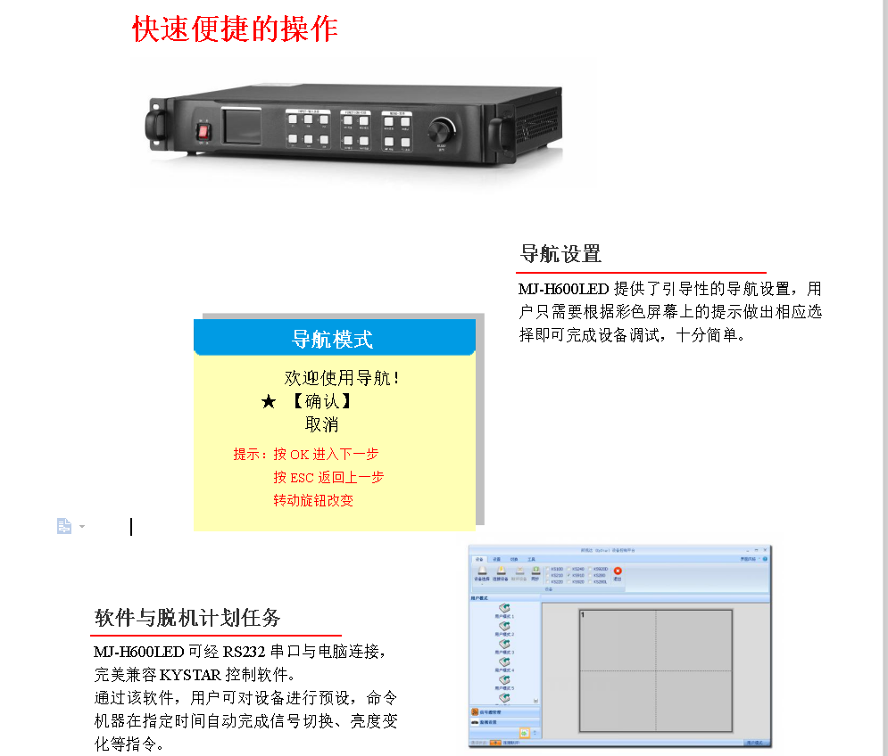 人性化交互界面 | .MJ-H600LED配備了彩色液晶面板、數(shù)字按鍵及調(diào)節(jié)旋鈕,并支持導航式設(shè)置 |