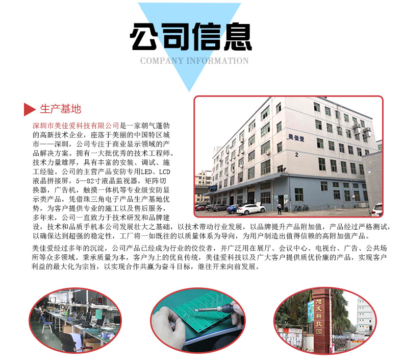 關于我們 公司介紹 企業(yè)文化 聯(lián)系我們 | 產(chǎn)品中心 液晶拼接屏 液晶廣告機 LED顯示屏 觸摸一體機 液晶監(jiān)視器 | 新聞資訊 公司新聞 行業(yè)動態(tài) | 工程案例 店面專顯案例 商用專顯案例 安防專顯案例 | 服務支持 定制服務流程 售后服務 | 全國服務熱線 18923424118 地址:深圳市光明新區(qū)公明街道振興路8號 后海旭發(fā)科技園2棟3樓 | ![]() |