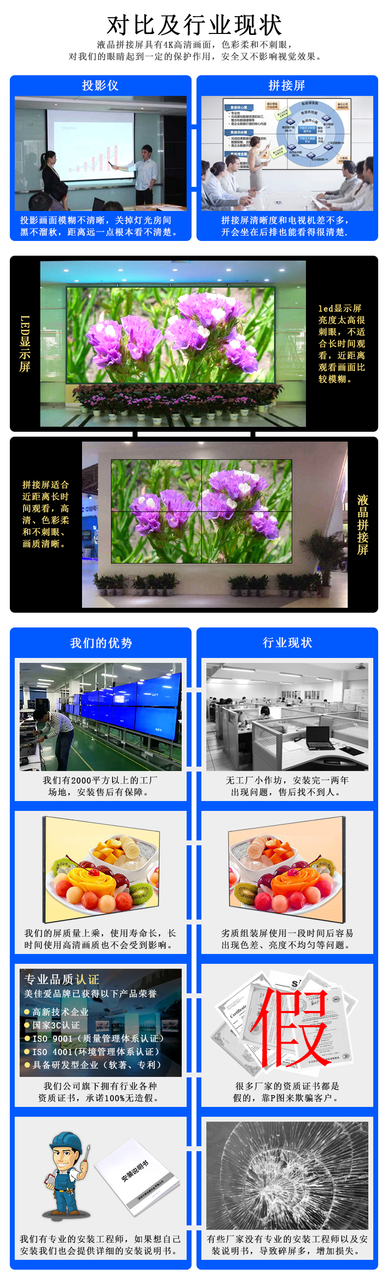 【美佳愛-4k液晶拼接屏生產廠家電話400-997-9971】原裝LG55寸液晶拼接屏0.88mm500cd產品通過ISO9001_3C_節(jié)能認證等30多項認證,主營LG/京東方/三星大屏幕電視墻,其尺寸有32寸40寸43寸46寸49寸55寸65寸75寸液晶拼接單元,也有曲面,弧形,柔性,無縫LED顯示屏,顯示器,超窄邊高清監(jiān)視器,提供企業(yè)展廳展示,KTV,酒吧,會議室,視頻監(jiān)控系統(tǒng)解決方案設計-報價-安裝施工-售后超窄邊維修等服務