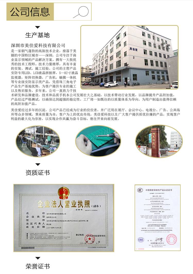 【深圳市美佳愛-液晶廣告機(jī),觸摸一體機(jī)生產(chǎn)廠家電話400-997-9971】55寸紅外觸摸一體機(jī)(安卓/壁掛)產(chǎn)品通過ISO9001_3C認(rèn)證,主營多點紅外/電容式觸摸屏一體機(jī),觸控查詢一體機(jī),其他尺寸18.5寸21寸24寸27寸32寸40寸43寸46寸49寸55寸65寸75寸86寸98寸100寸多功能多媒體教學(xué)會議一體機(jī),戶外立式/壁掛雙面廣告機(jī),單機(jī)版/安卓網(wǎng)絡(luò)廣告機(jī) 豎屏樓宇電梯廣告機(jī),長條型屏,工業(yè)級工控電腦觸摸顯示器,大尺寸觸摸屏查詢系統(tǒng),商顯平板電腦電視,提供報價價格,安裝施工,售后維修等